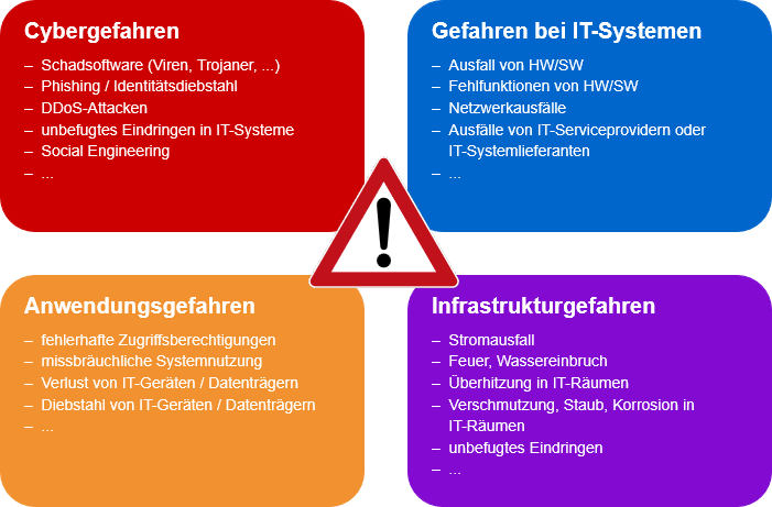 Sowohl die Entwicklung der letzten Jahre als auch alle Prognosen für die Zukunft zeigen ein exponentielles Wachstum von Cybergefahren und Cyberangriffen. Die Gefährdung der Informationssicherheit erfolgt aber nicht nur durch IT-Sicherheitsverletzungen und Cyberangriffe, sondern auch durch technische Gefahren, Gefahren bei der Anwendung von IT-Systemen und generellen Infrastrukturrisiken: